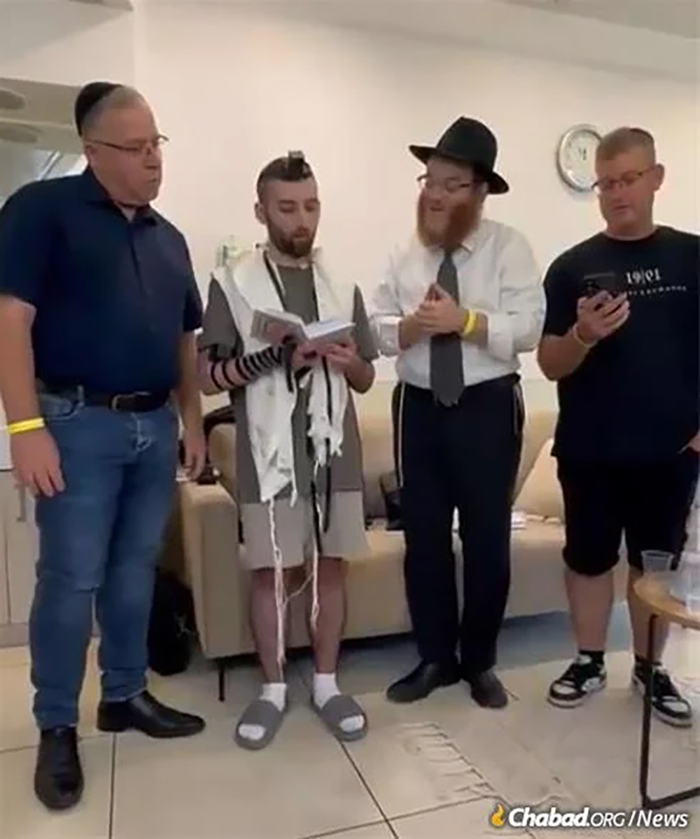 The family’s living room was transformed into a makeshift synagogue. Relatives, neighbors, and friends gathered quietly around Matan, joining him in the ancient Psalm of thanks. Some wept as he began, others held prayer books, their voices rising softly with his.