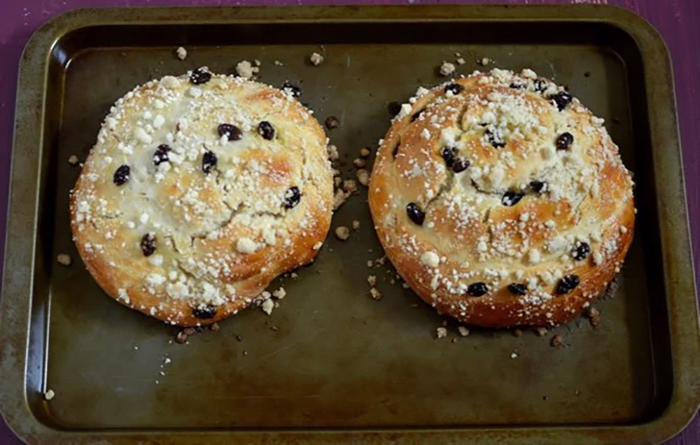Put the challahs on greased baking trays, brush with egg and sprinkle with the crumb topping. Let them rise another 40 minutes and then bake at 375° F until golden brown, approximately 45 minutes.