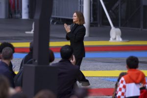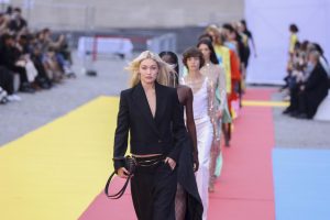 A yellow, red and blue carpeted runway dazzled VIP guests for designer Stella McCartney’s fashion show in the outdoor courtyard of Paris’ Pompidou Center — a set created in homage to the art museum’s famed colored, structuralist exterior in the background.