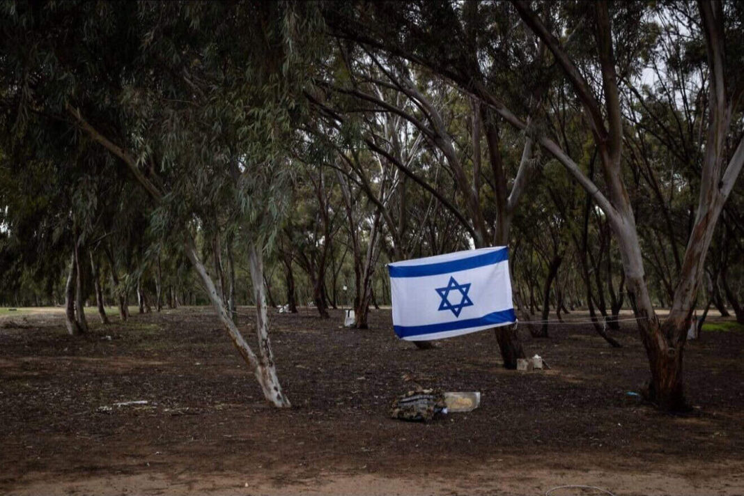 An Israeli flag in Re'im, the site of the Nova music festival in southern Israel near the border with the Gaza Strip, which was attacked by Hamas terrorists who slaughtered 364 people there on Oct. 7, 2023. Credit: Alex Kolomoisky, KKL-JNF.