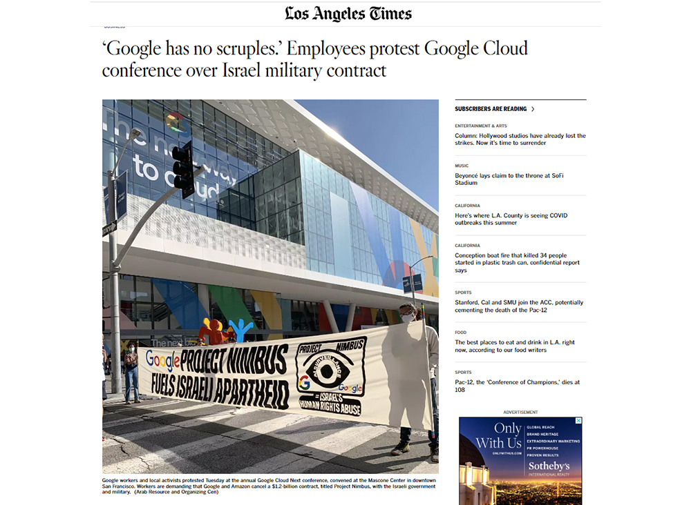 MPower Change & JVP joined AROC: Arab Resource & Organizing Center Palestinian Youth Movement (PYM)- حركة الشباب الفلسطيني Jewish Voice for Peace Bay Area Anti Police-Terror Project, the International Jewish Anti-Zionist Network & more to turn out 100s to Google Cloud‘s biggest conference of the year, where the company celebrated its first year of profitability.