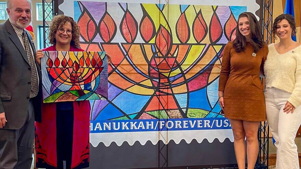 The USPS states, “The stamp art features the design from an original wall-hanging. The fiber art was hand-dyed, appliquéd and quilted to form an abstract image of a hanukkiah.”