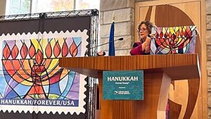 A first-day-of-issue dedication ceremony for the stamp was held last Thursday at Temple Emanu El in Orange Village, Ohio, an eastern suburb of Cleveland. This year, Hanukkah begins on the evening of Dec. 18.