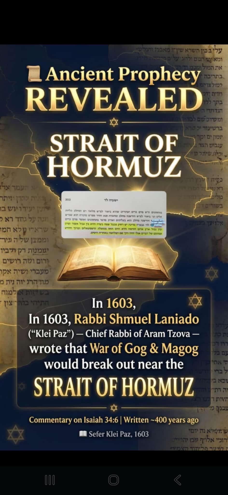 A second prophecy regarding the war with Iran is from Rabbi Shmuel Laniado in 1603, who wrote that the war of Gog & Magog (the final war before the coming of the Messiah) will break out near the Strait of Hormuz, currently in the news, because it is a crucial waterway for oil shipments from Arab countries to the rest of the world.