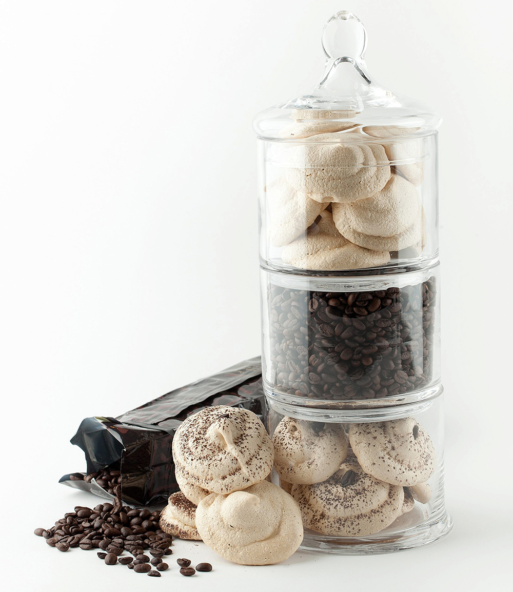 Working quickly, drop the mixture by large spoonfuls onto the prepared baking sheets, spacing them 1 to 2 inches apart. Top each meringue with an optional coffee bean and dust with cocoa.