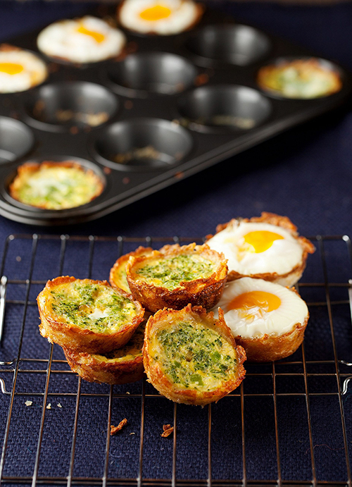 These are the perfect do-ahead hash browns for a brunch, and they can be filled and baked with several variations below. They’re also good as an alternative to fried potato latkes (no frying mess with these) and are perfect for topping. Get creative and vary your toppings—sautéed peppers, smoked salmon, sour cream, etc. *These can be made a day ahead. Refresh uncovered in a hot oven to re-crisp the cups.