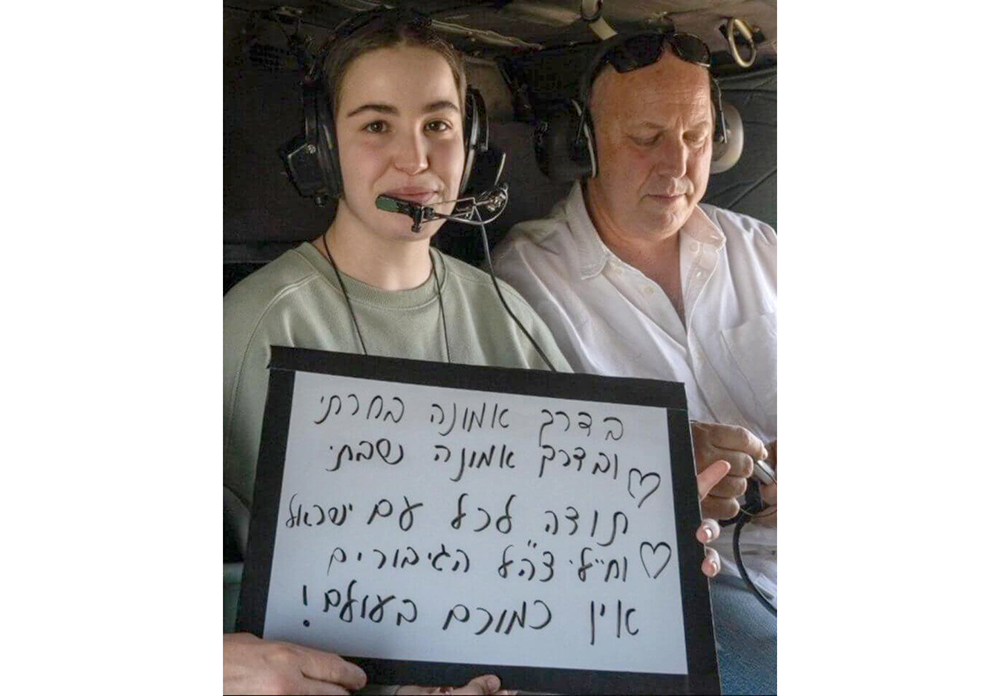 After her release, Agam was taken by helicopter to Sheba Medical Center. Inflight, she wrote a message on a whiteboard for Am Yisroel “Bederech emuna bocharti, I chose a path of faith, (Tehillim 119:30) “u’vaderech emuna shavti, And in the path of faith I returned.